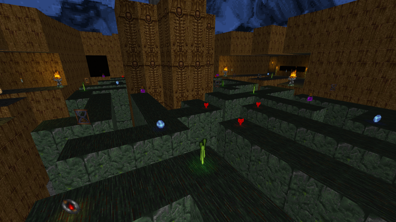 The final official level of Heretic (not counting the weird unlisted bonus episode) is a rather nondescript arena map. You start off in a vaguely spider-shaped chamber that dumps a bunch of gear and ammo on you. Use the Wings of Wrath to get onto the Trident sigil and the walls fall away to reveal between three to eight maulotaurs depending on difficulty. If you have an invincibility ring and a tome already on level start, then you can use the extras you pick up to make this fight relatively trivial, otherwise get ready to dodge a lot. Kind of disappointing as a last level, but what did you expect?-June<3